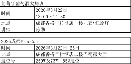 大师班将于3月22日13:00–14:30在成都香格里拉酒店一楼九寨·红原厅举行。课程将系统介绍葡萄牙主要产区、本土葡萄品种、酿酒文化与代表性风格,并现场品鉴12款来自参展酒庄的精选佳酿,全面呈现葡萄牙葡萄酒的层次与魅力。