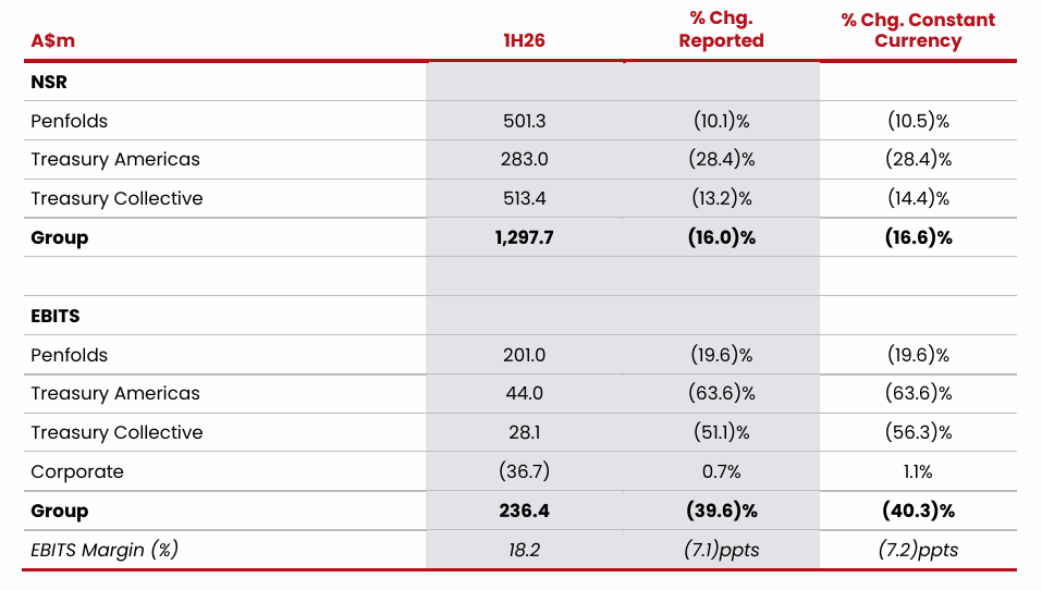 近日,富邑集团(Treasury Wine Estates)发布2026财年半年度(2025年7月1日-12月31日)业绩,其全球净销售收入约13亿澳元(约合人民币:63.2亿元),同比下滑16%。从集团整体来看,净销售收入的下滑主要受到美国及中国葡萄酒品类趋势走弱的影响,同时集团为遏制平行进口主动限制了对亚洲(除中国外)及澳大利亚的出货,叠加上一财年中国关税取消后渠道搭建形成的高基数,共同导致了出货量的同比下降。