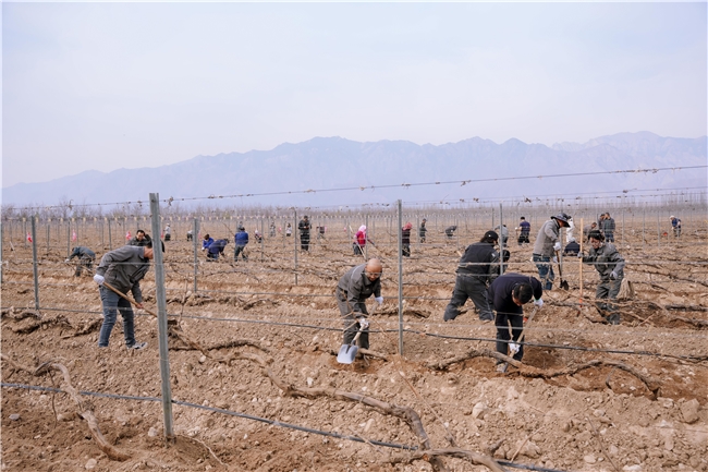 “冬藏埋土,迎春展藤”,是贺兰山东麓独有的农耕传统,更是美贺庄园坚守品质的第一道防线。为抵御北方严寒,去年冬日,葡农们将葡萄藤精心覆土,让枝蔓在泥土中积蓄力量。